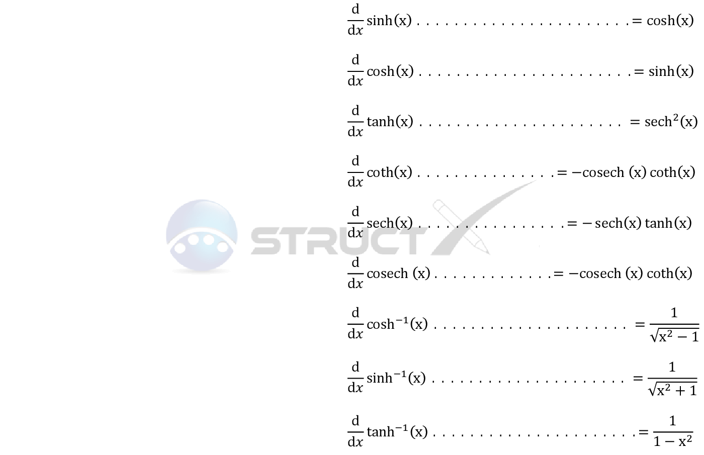Hyperbolic derivatives math. Y a r c c o s h x y text arccosh x y arccosh x. 2 c s c h 4 x 3 1 2 c o t h 4 x 3 1 d d x 4 x 3 1 2 mathrm csch left 4x 3 1 right 2 mathrm coth left 4x 3 1 right frac d dx left 4x 3 1 right 2csch 4x3 1 2 coth 4x3 1 dxd. Taking the derivative of hyperbolic cosecant. The last set of functions that we re going to be looking in this chapter at are the hyperbolic functions.